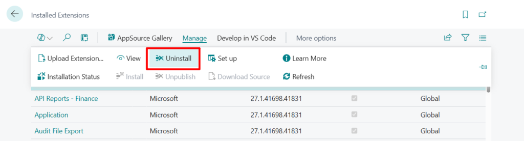 More details: Install and uninstall extensions (apps) in Business Central