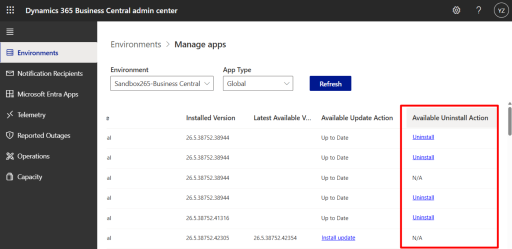 Open the Business Central administration center and select the environment from which you want to uninstall the apps. More details: Granular administration as Dynamics 365 Business Central Administrator (New BC admin role in Microsoft 365 admin center)