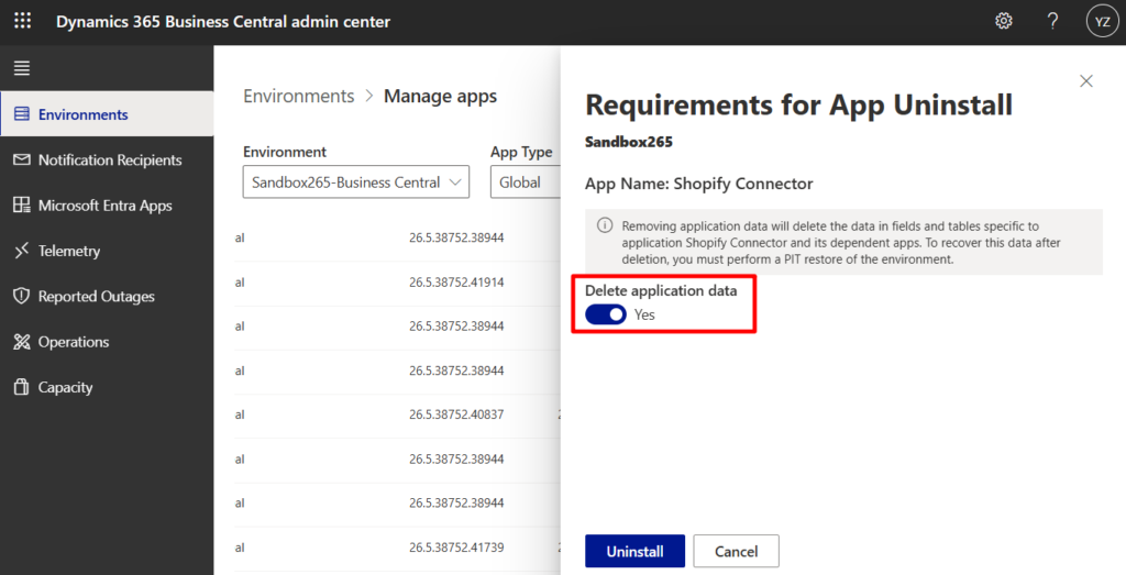 When uninstalling an app, it’s possible to delete application data as well. This action deletes data in fields and tables created by the application you’re uninstalling. If application data is deleted, the only way to recover it afterwards is by performing a point-in-time restore of the environment.