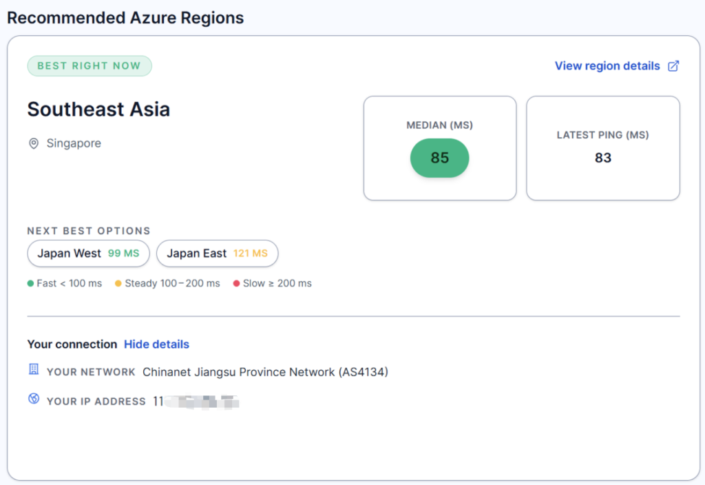 Then there are the test results from AzureSpeed.com: Southeast Asia > Japan West > Japan East.