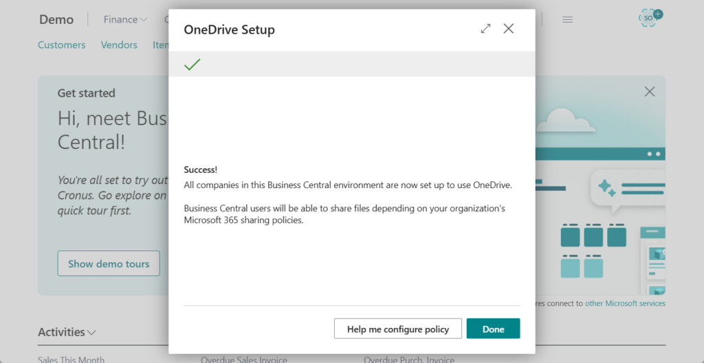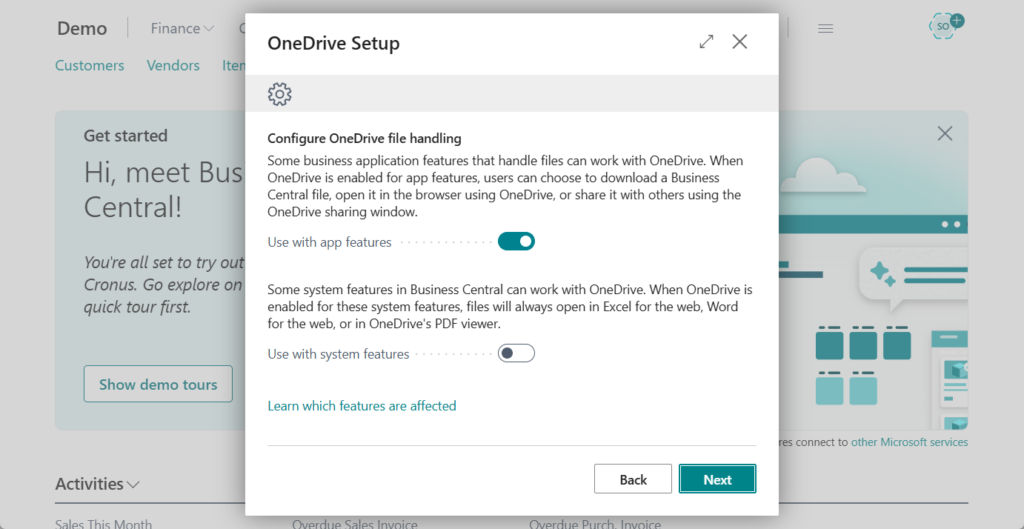 In the OneDrive Setup assisted setup guide for setting up OneDrive integration, you can turn on or off features for handling Business Central files in OneDrive. The features are divided between two options: