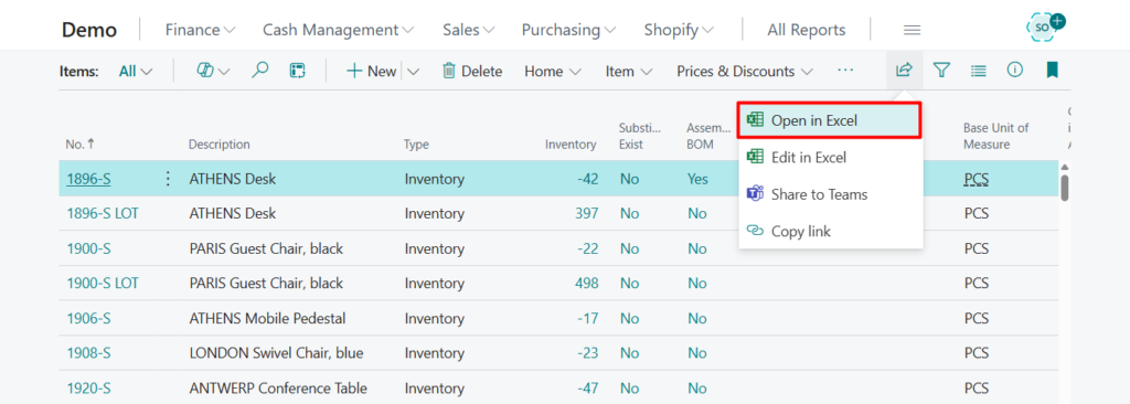 With the Open in Excel action, you can make changes to the records in Excel, but you can’t publish the changes back to Business Central. You can only save the changes to the Excel file, without affecting data in Business Central.