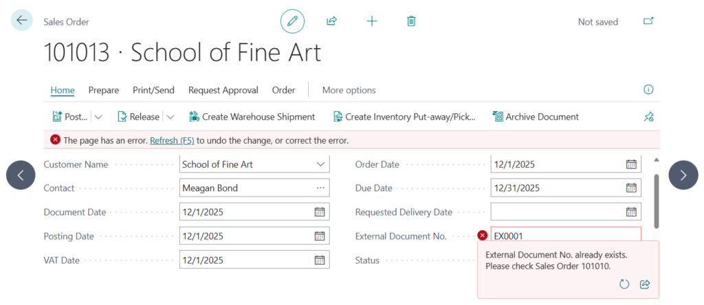 Case 1: The external document number already exists in the Sales Header