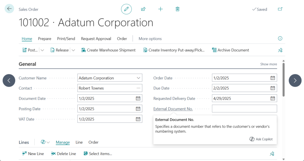 In Business Central, you can enter external document numbers for customers and vendors in all sales and purchase orders, invoices, and credit memos. For example,