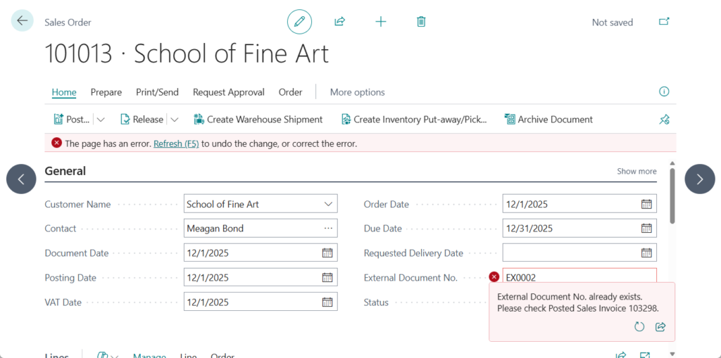 Case 2: The external document number already exists in the Sales Invoice Header