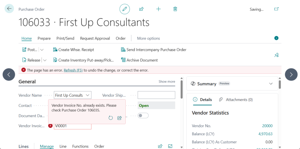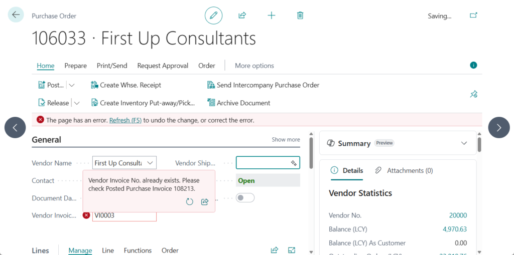 Error('Vendor Invoice No. already exists. Please check Purchase Order %1.', PurchaseHeader."No.");