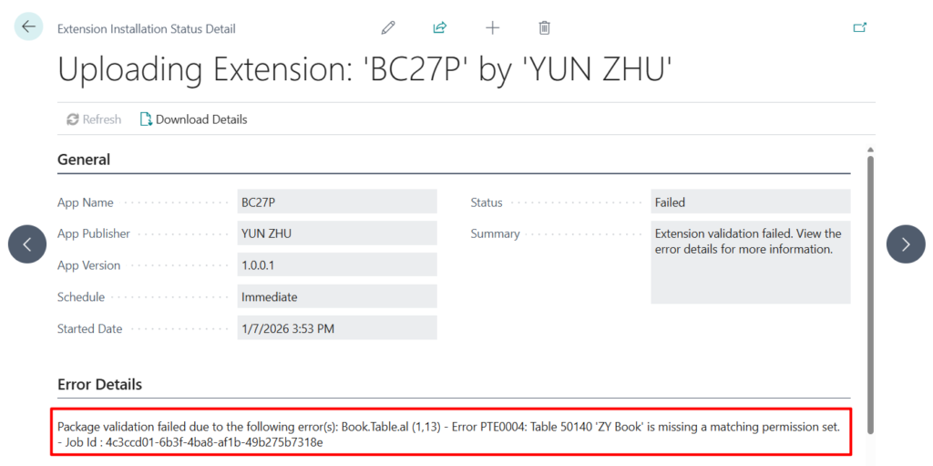Package validation failed due to the following error(s): Book.Table.al (1,13) – Error PTE0004: Table 50140 ‘ZY Book’ is missing a matching permission set. – Job Id : 4c3ccd01-6b3f-4ba8-af1b-49b275b7318e