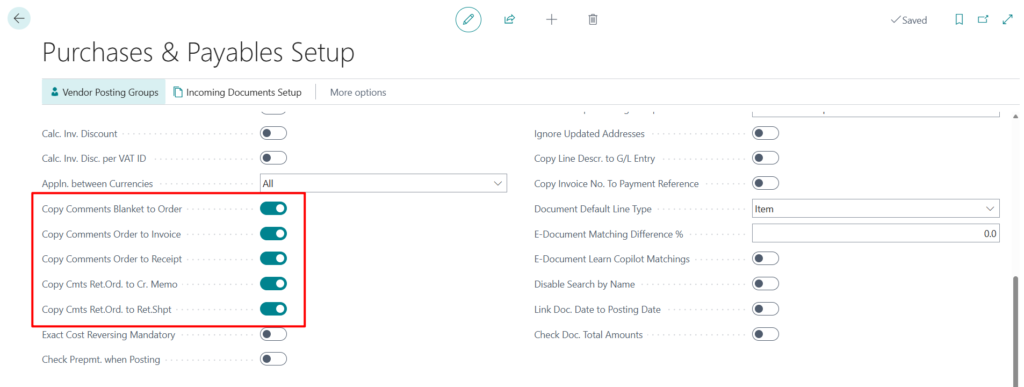 Comments on ongoing documents are transferred to the related posted document. For example, a comment on a purchase order is transferred to a resulting posted purchase receipt. In addition, you can specify if you want comments to be transferred from one type of document to another resulting type of document, such as from a purchase order to a purchase invoice. You do this in the Purchases & Payables pages respectively.