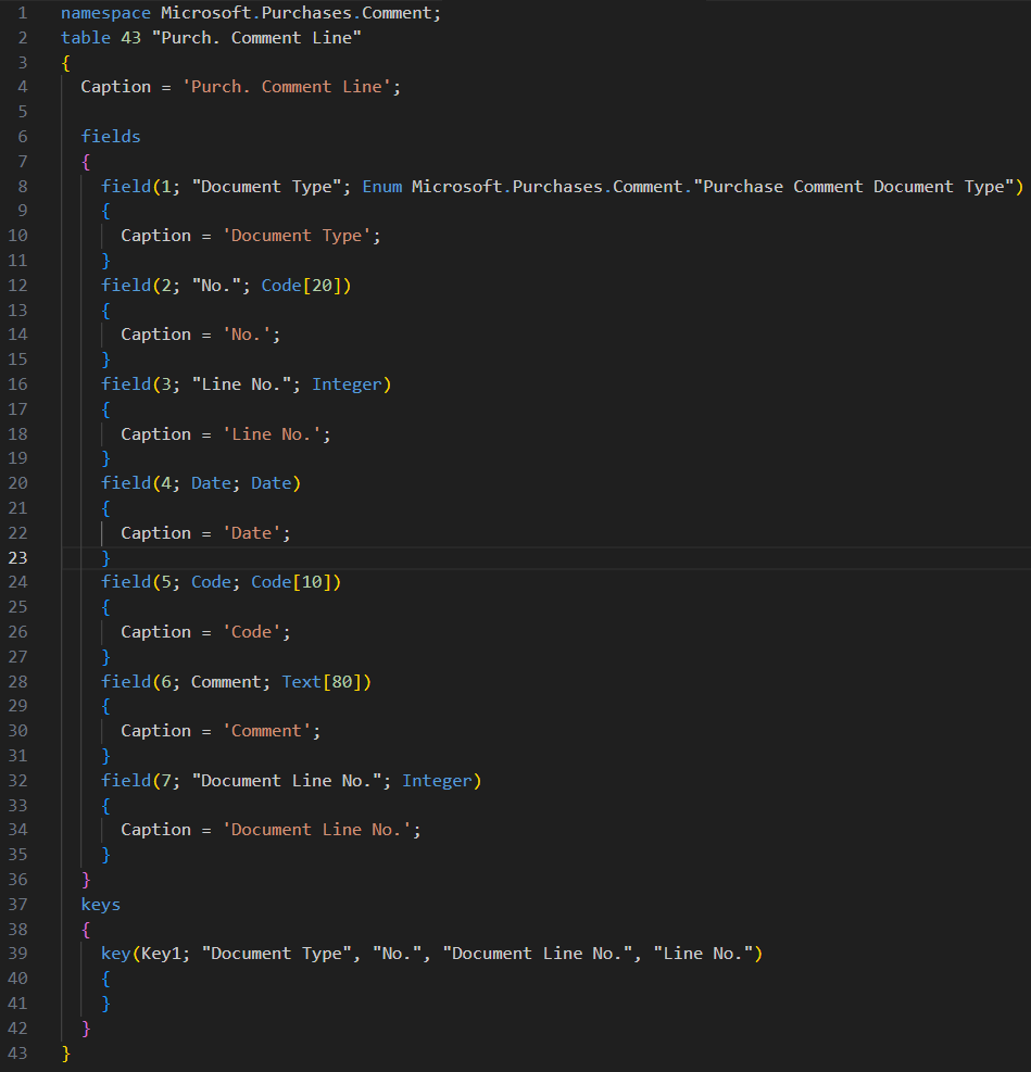 Same table (table 43 “Purch. Comment Line”): procedure CopyComments