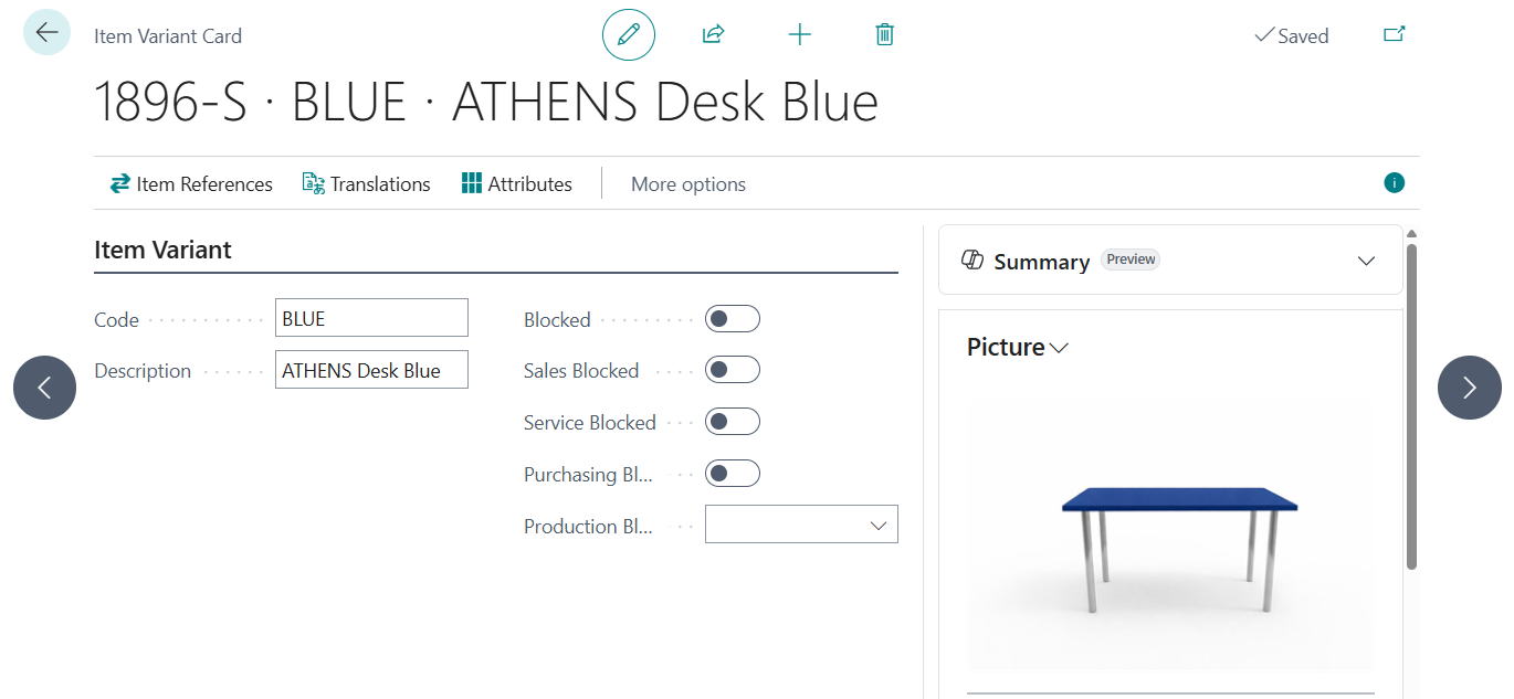 You can now store pictures for item variants, letting you add images that represent each variant, such as color or size, so you can quickly recognize differences. You can take a picture, import an existing file, export the current image, or delete it from a Picture FactBox on the Item Variant Card page.