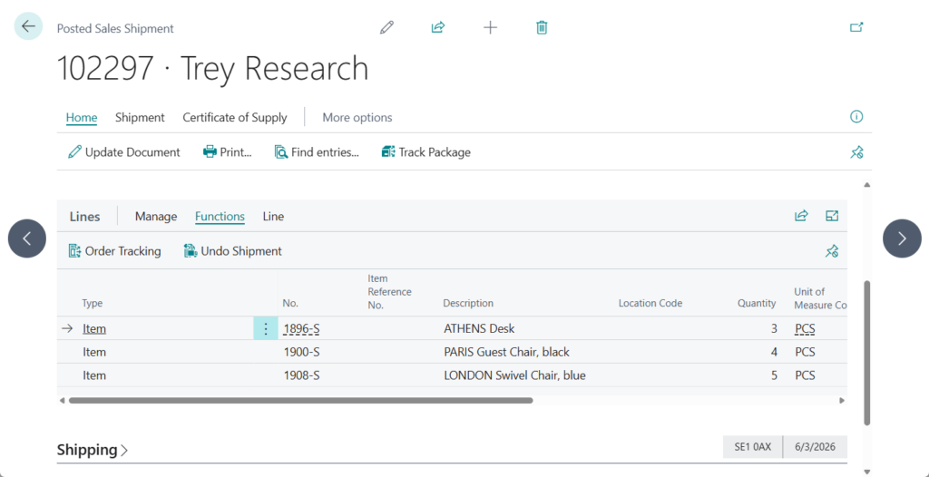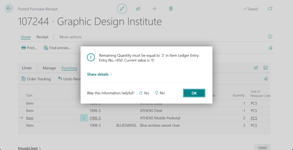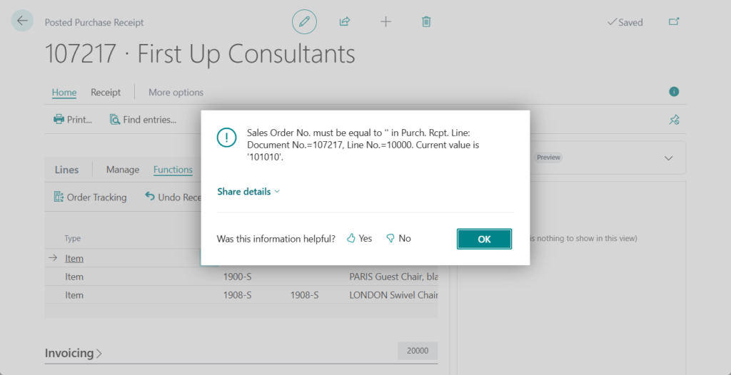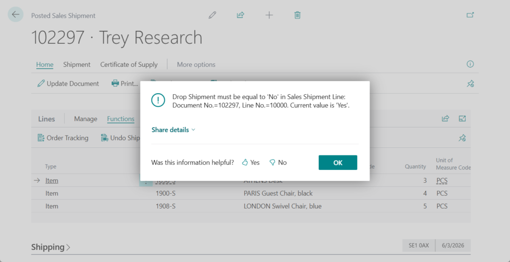 Today, when you post a purchase receipt for a drop shipment, Business Central also posts the linked sales shipment and you can’t undo the receipt. For example,
