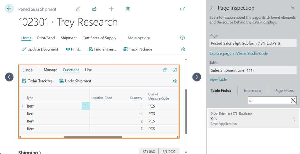 To create drop shipments, we must first add the Drop Shipment field to Lines (it is hidden by default, but can be added using features such as Personalization).