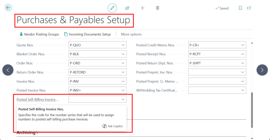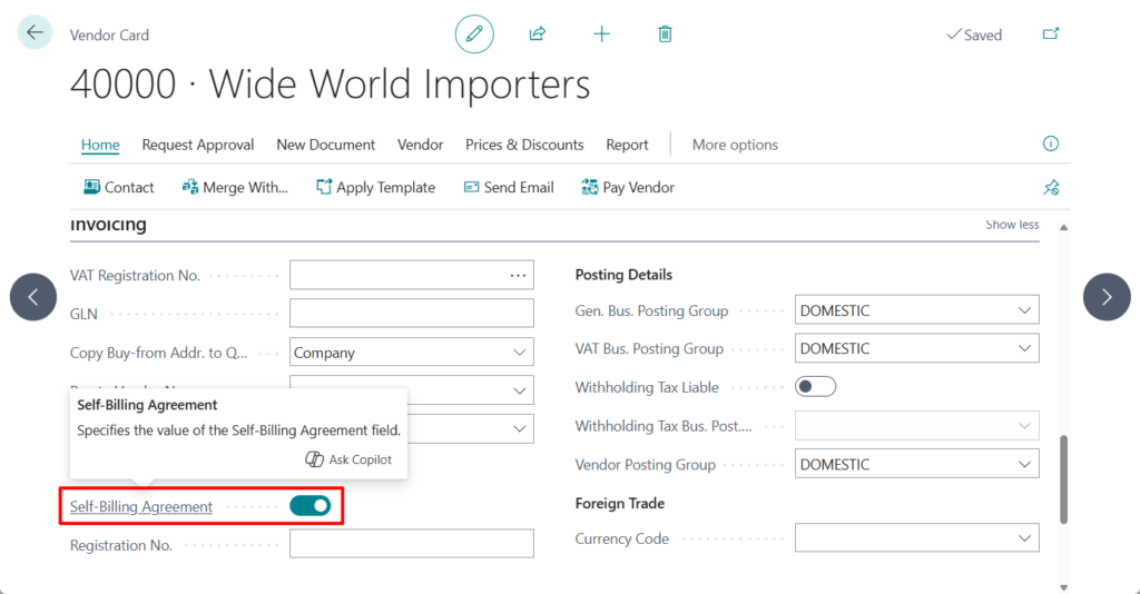 Vendors can also be assigned a dedicated No. Series for self‑billed invoices, ensuring correct document sequencing.