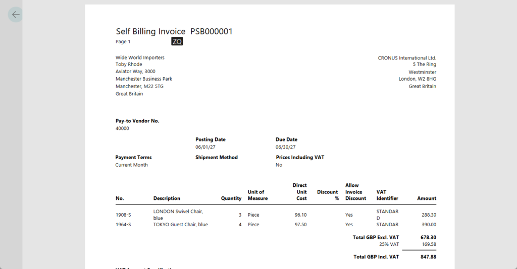 Finally, a new report layout, Posted Purchase Invoice – Self‑Billing Invoice, formats the invoice to align with the sales invoice style, showing buyer company information, vendor details, VAT information, and all essential invoice data.