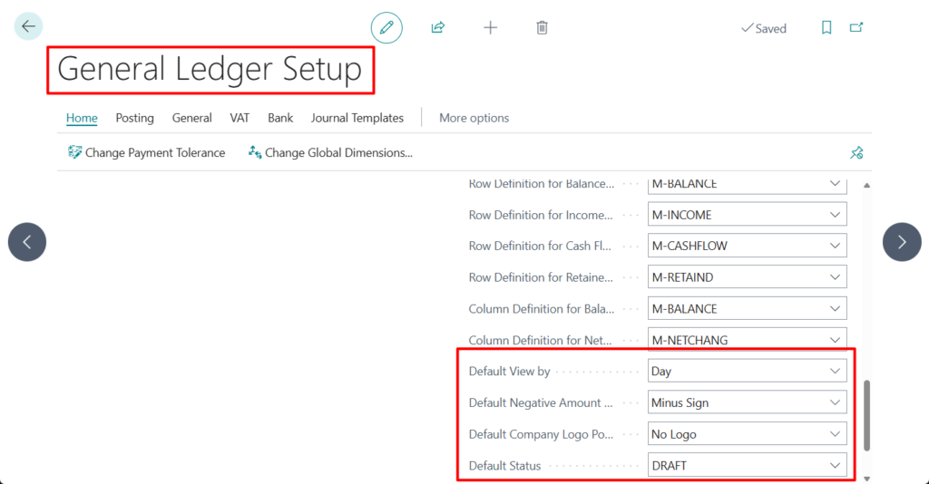 - Set global defaults for negative number format, report period, and logo placement.