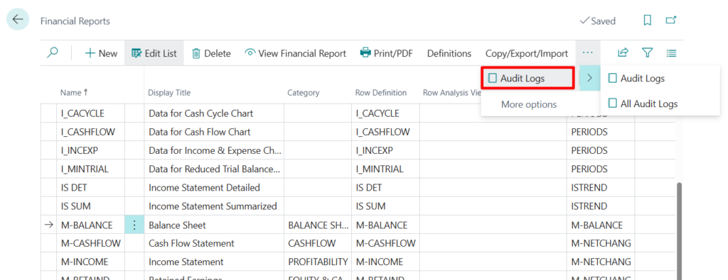 In Business Central the Financial Reports feature gives you insights into the financial data shown on your chart of accounts (COA). You can set up financial reports to analyze figures in general ledger (G/L) accounts, and compare general ledger entries with budget entries. Business Central provides sample financial reports you can use right away as templates. You can also set up your own reports to specify the figures to compare.